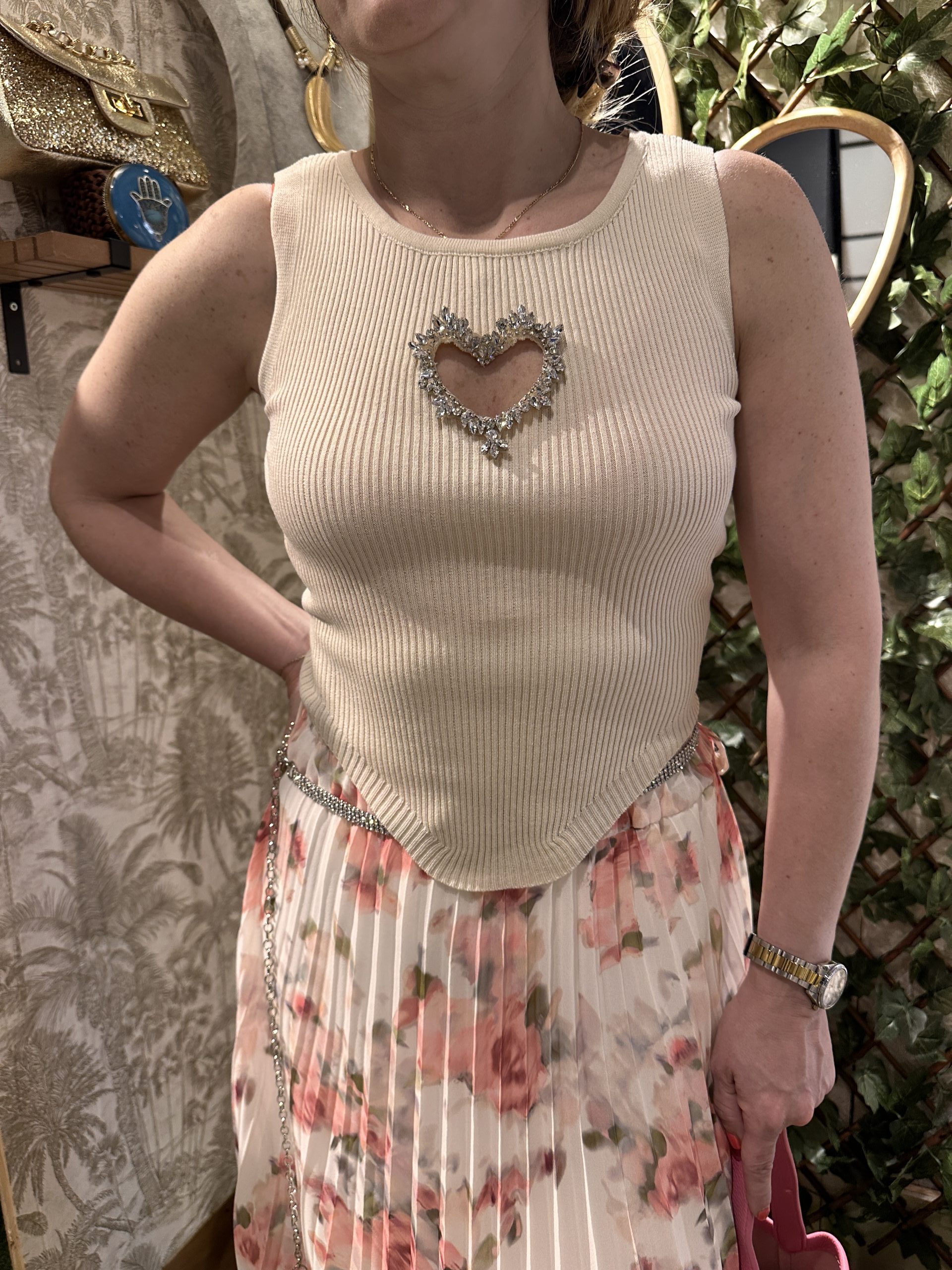 Tejido de punto canalé suave y elástico. Color crema neutro. Escote redondo. Apertura en forma de corazón con pedrería brillante. Corte ajustado y favorecedor.