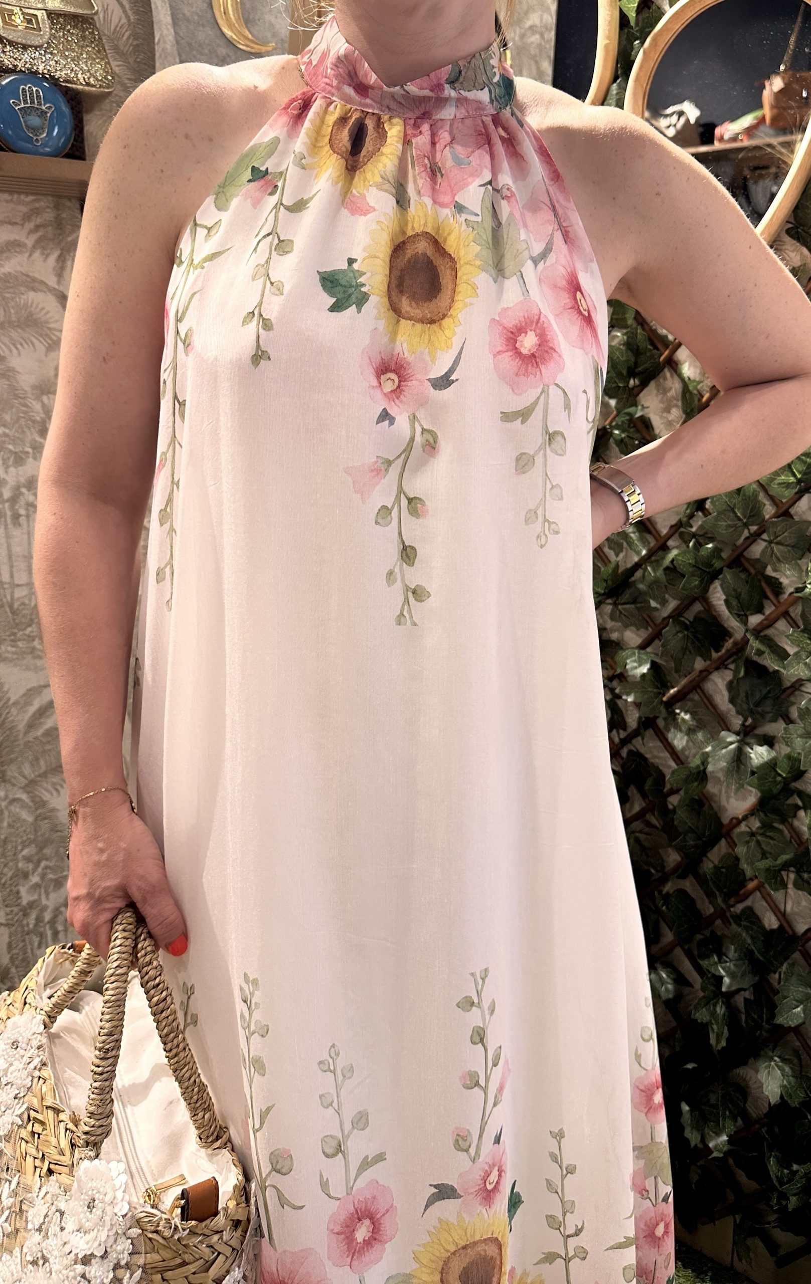 Tejido ligero y vaporoso. Estampado floral vibrante en tonos rosados, amarillos y verdes. Forro interior. Diseño largo y holgado. Cuello halter anudado en la nuca. Sin mangas.